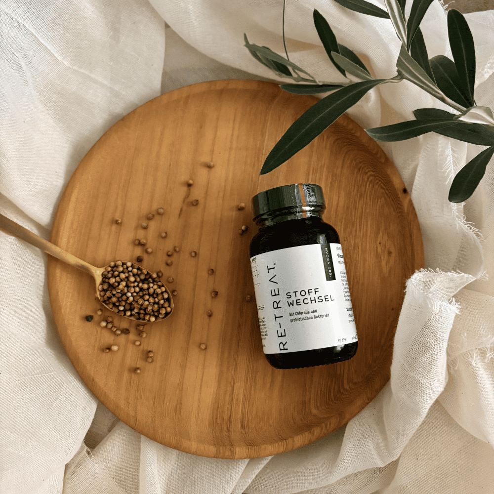 Unser Stoffwechsel und die Verdauung können nur mit einer gesunden Darmflora optimal funktionieren. Laktobazillen, auch als Milchsäurebakterien bezeichnet, unterstützen die Verdauung, stärken die Schutzfunktion der Darmbarriere und verdrängen „schlechte“ Keime wie z.B. schädliche Kolibakterien. Die Süßwasseralge Chlorella ist reich an Aminosäuren, Mineralstoffen, Vitaminen und Antioxidantien und sorgt gemeinsam mit Beta Glucan für einen aktiven Stoffwechsel. Koriander stimuliert die Ver- dauung, der Vitalpilz Polyporus umbellatus regt die Nierentätigkeit und den Lymphfluss an.